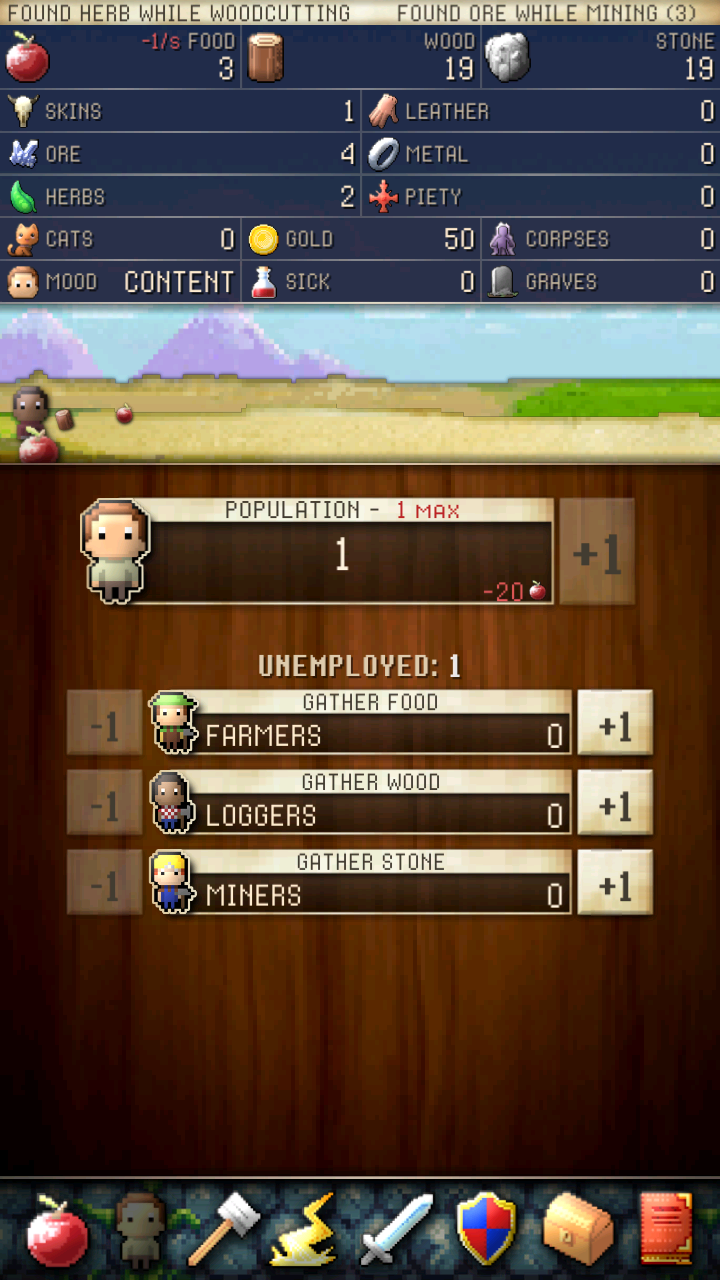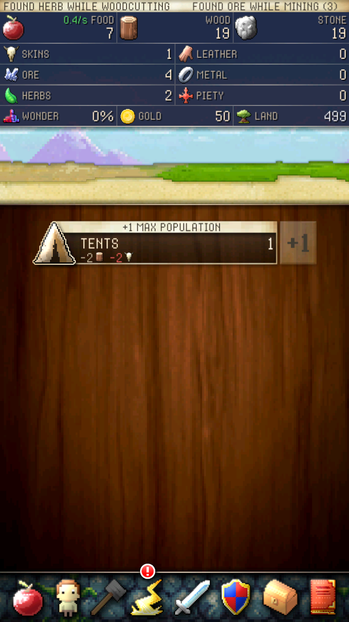 除了基础资源,游戏还有毛皮、矿石、草药等高级材料,可以加工成皮革、金币等更有价值的物品。随着资源积累,可以组建军队、扩张领土,并解锁新的科技和能力。人口可以帮助你采集更多资源,但是食物支出超过获取,会导致资源减少、人口下降。