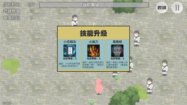 4、升级后可以在三个随机技能中选择一个进行升级。