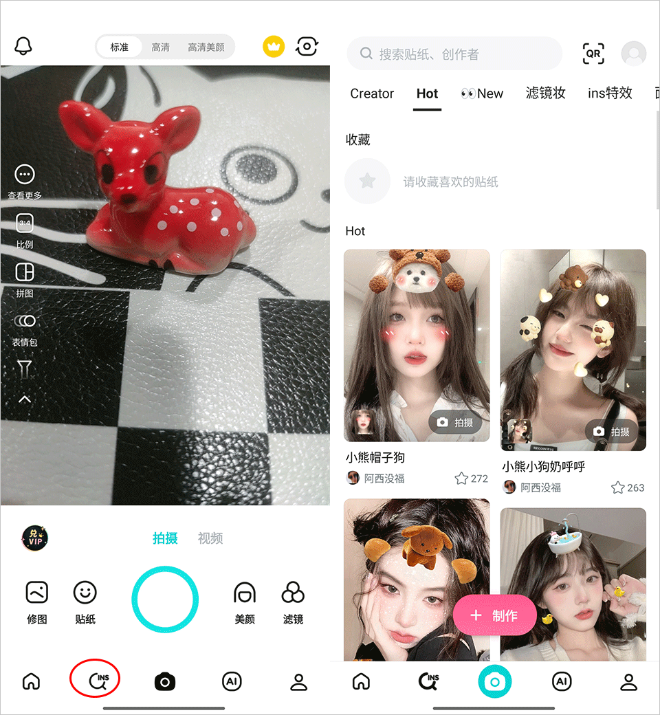 2、但其实更多的贴纸素材在这里,点击下方带ins字眼的放大镜。