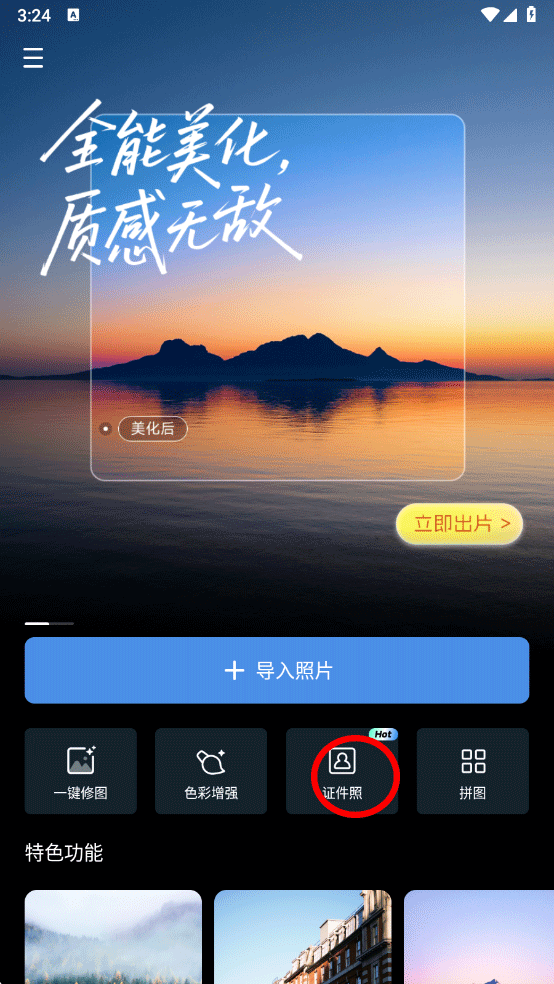 1、打开光影魔术手手机最新版进入首页点击证件照
