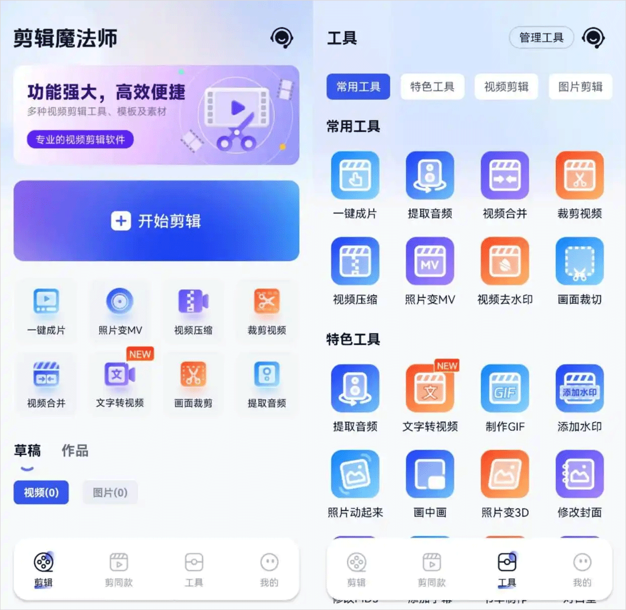 支持画面裁剪、修改MD5、添加字幕、书单制作、视频变漫画、视频配音、文字视频、提词器、消除笔、格式转换等