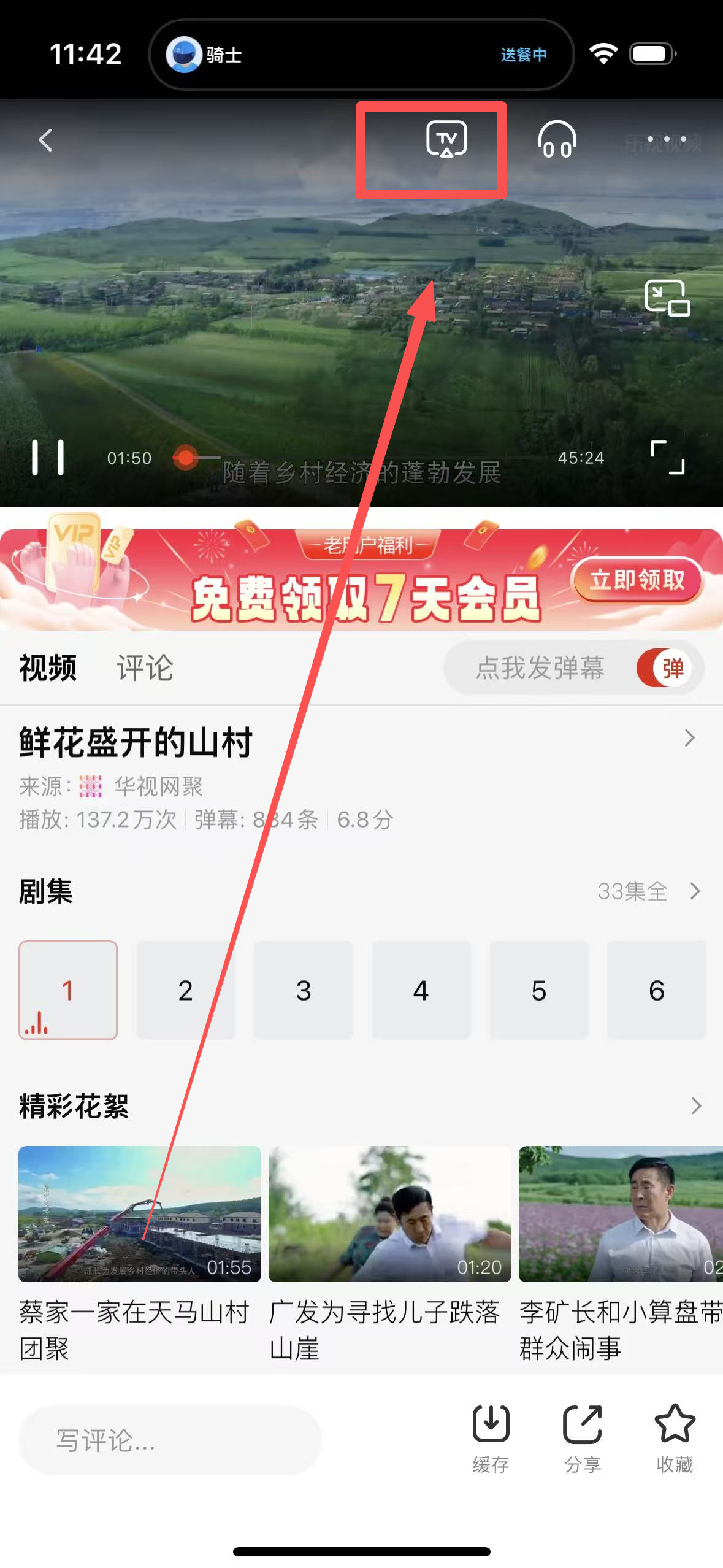 2、点击视频出现播放进度后再点击上方的TV标志