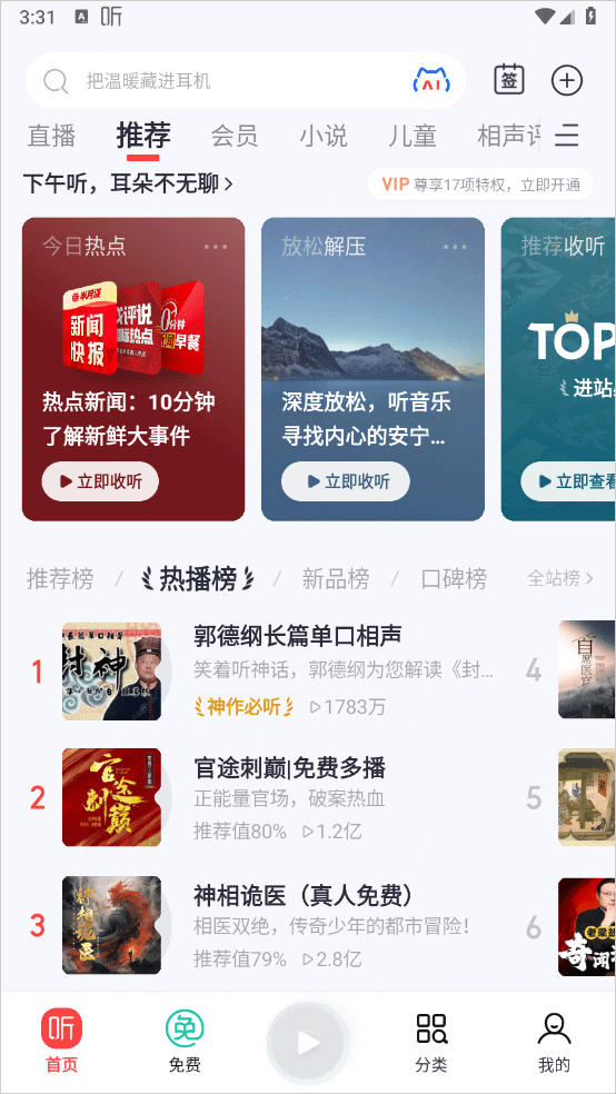 2、离线下载:支持内容下载到本地,无网络环境下也能畅听,适合通勤、旅行等场景。