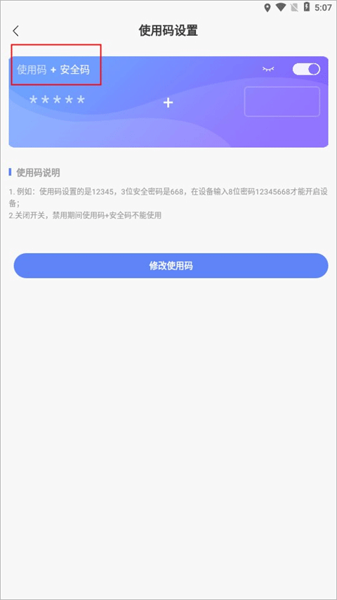 6、使用码设置需要使用码加安全码两部分组成,用户可以自行设置。