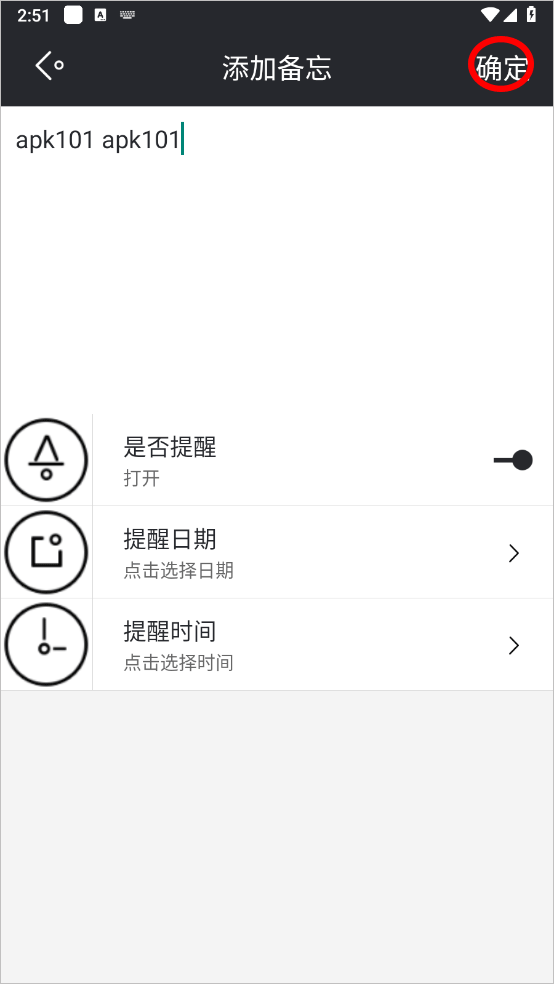 4、输入你要备忘的内容开启提醒设置好提醒日期及时间点击右上角的确定即可
