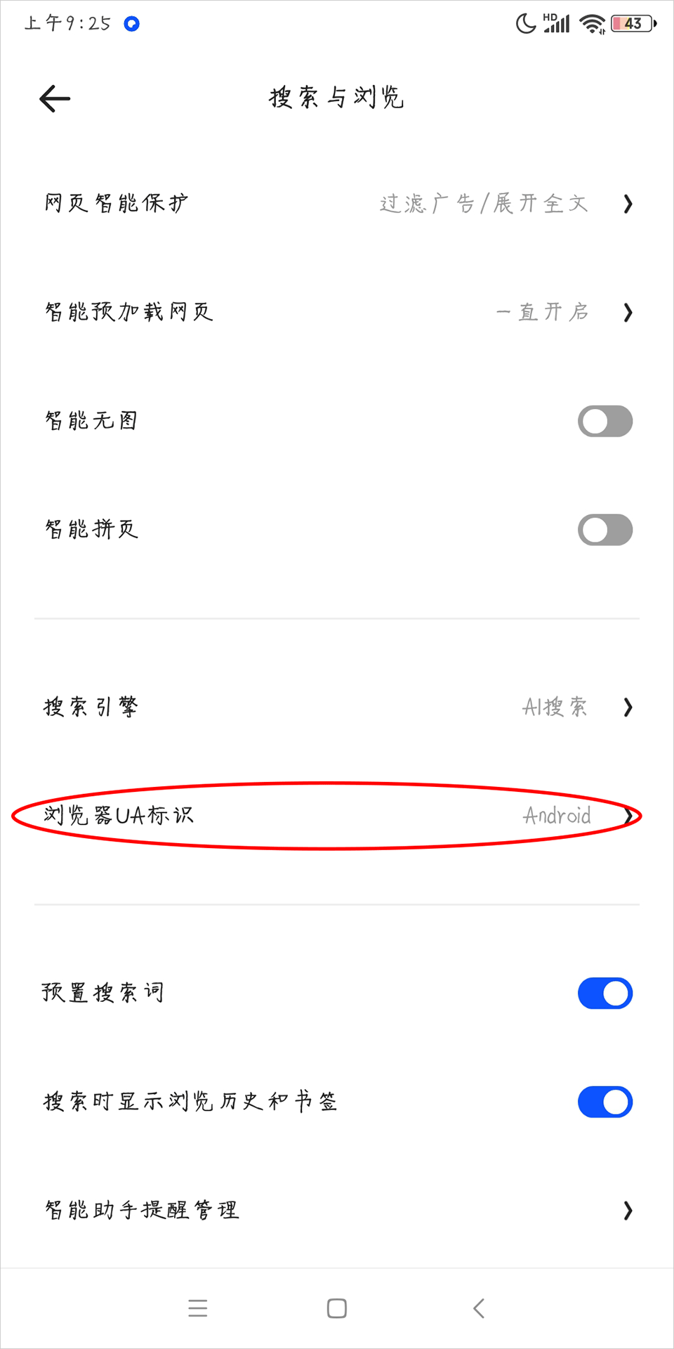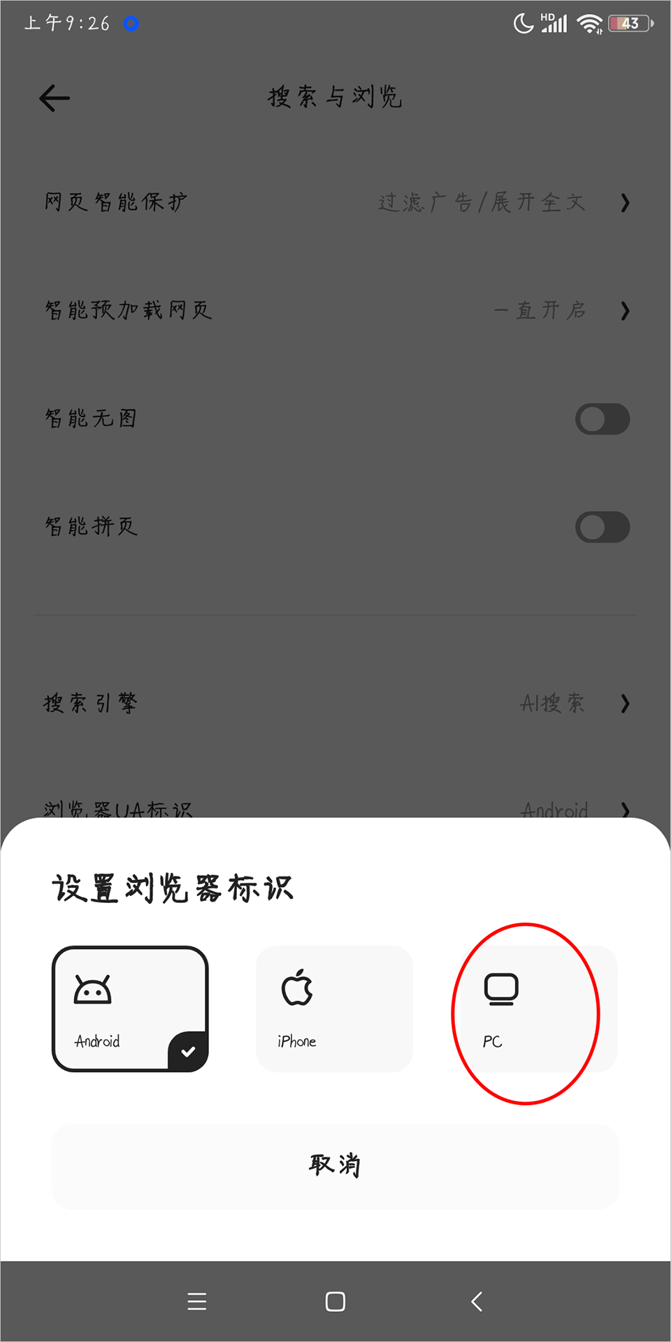 5、进入UA设置之后,点击上面的小电脑标志就进入了电脑模式浏览。