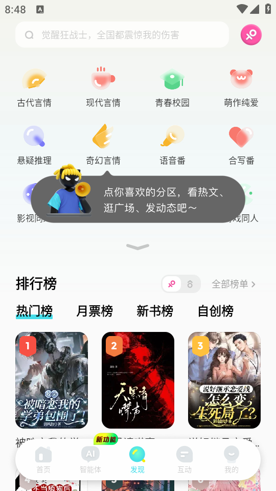 2、你可以在发现领域中找到相关热门原创小说;