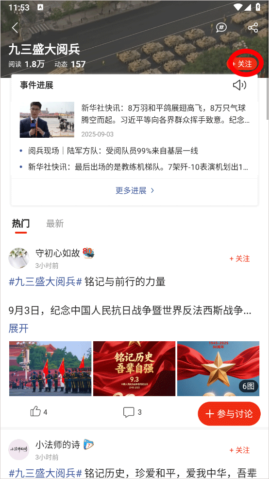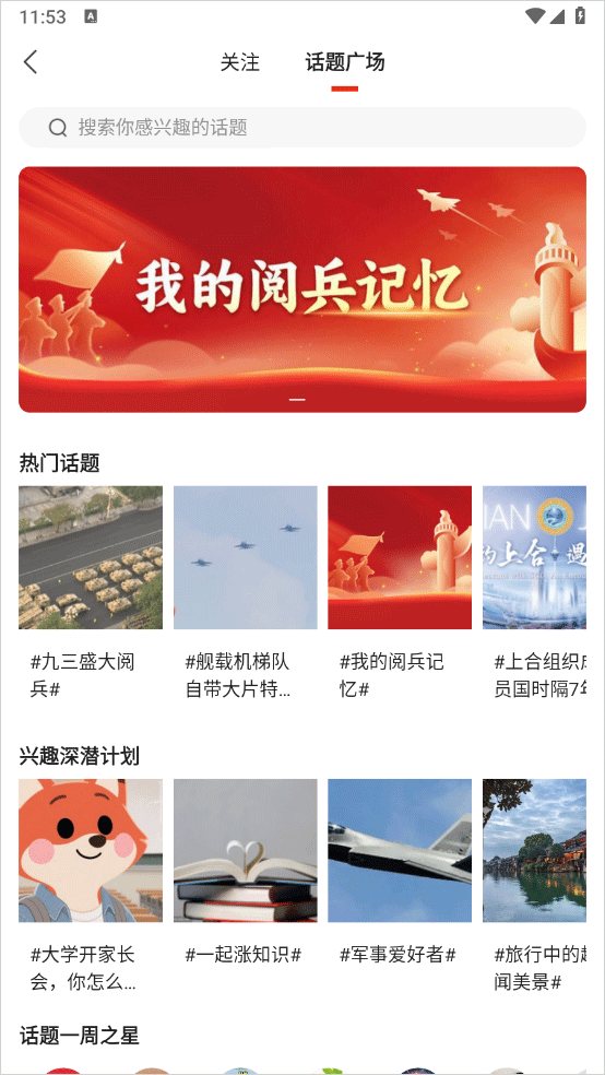 2、进入话题广场选择自己喜欢的话题进入或者直接在搜索框中搜索喜欢的话题