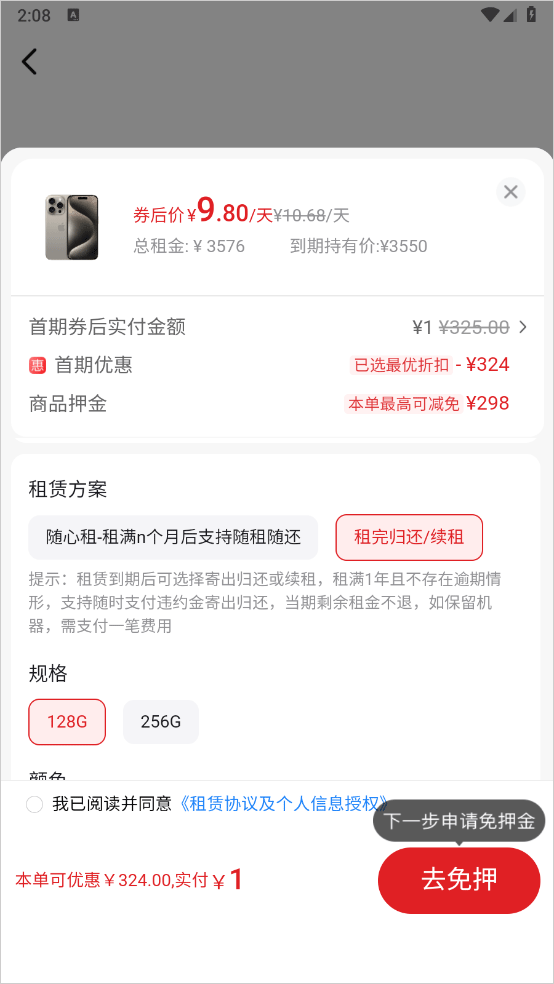 免押租金:下单过程中授权芝麻信用,系统将根据芝麻信用有机会享受0押金租赁服务。