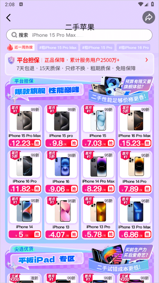 2、小编以苹果手机为例,进入二手苹果界面可以直接找到你要租的型号或者搜索框搜索型号