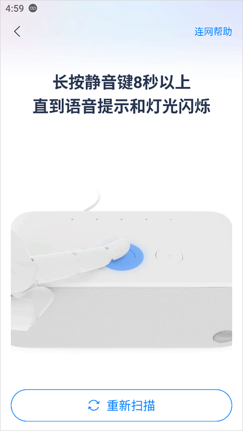 3、进入到扫描设备页面,开启蓝牙,长按静音键8秒以上,直到语音提示和灯光闪烁即可添加成功