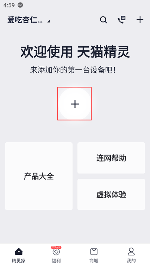 1、下载并打开天猫精灵app,在精灵家页面点击添加设备