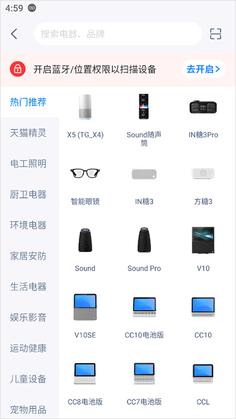 2、点击天猫精灵添加设备,选择对应的精灵型号(如果页面没有的话可以在搜索框直接搜索设备)