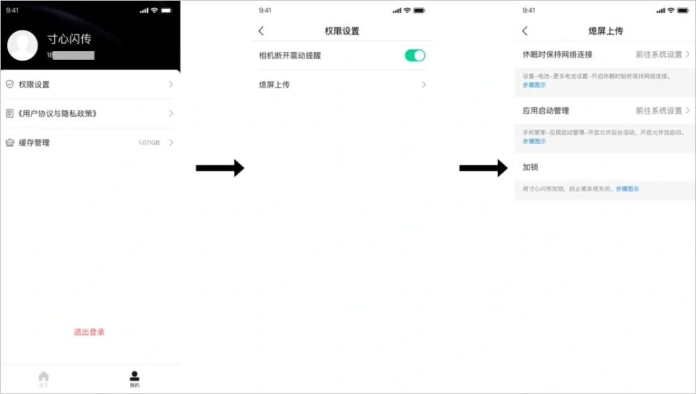 (2)寸心闪传APP中“我的一权限设置一熄屏上传”中根据提示设置相关权限