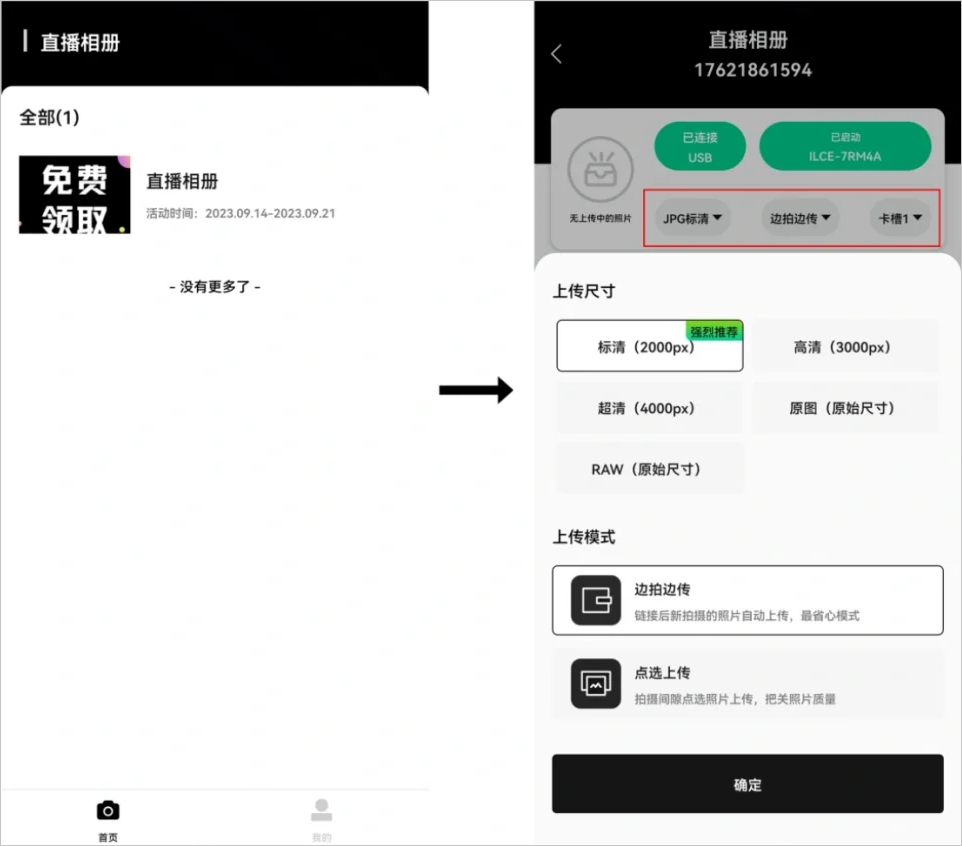 (1)启动寸心闪传,在相册列表中点击进入待上传相册-一点击进入相册--选择上传照片尺寸和上传模式--成功进入有线闪传页面。
