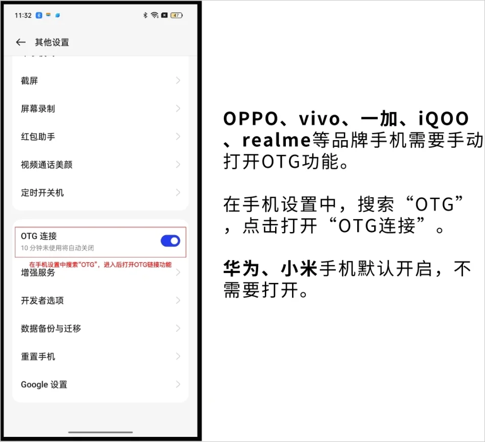 1、在手机设置中,搜索“OTG”,点击打开“OTG连接”