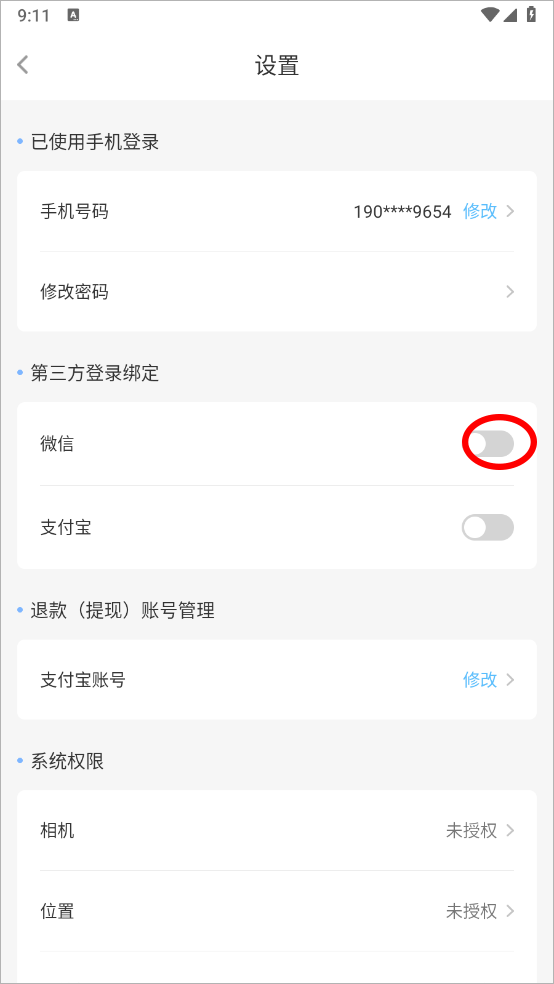 3、进在设置界面中的第三方登录绑定中开启微信后面的小图标