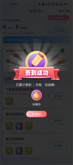 4、之后会来到任务中心页面,完成下列相应的任务可以获得萌币奖励。