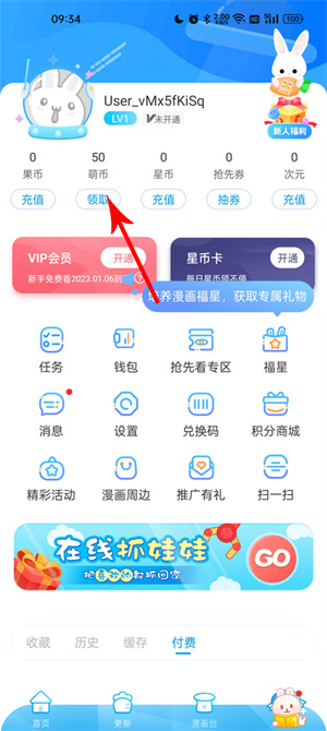3、进入我的板块之后,可以在头像下方找到萌币点击进行领取;