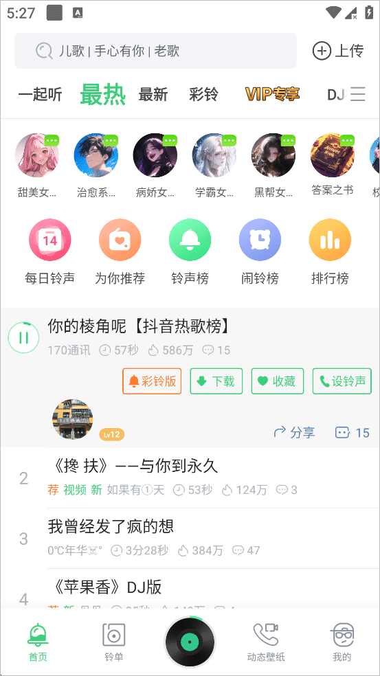 1、打开软件,首页会有热门推荐,以及还有最新彩铃直接点击播放试听,点击音乐下方的设铃声便可以设置来电铃声、短信提示声、闹钟等多种铃声