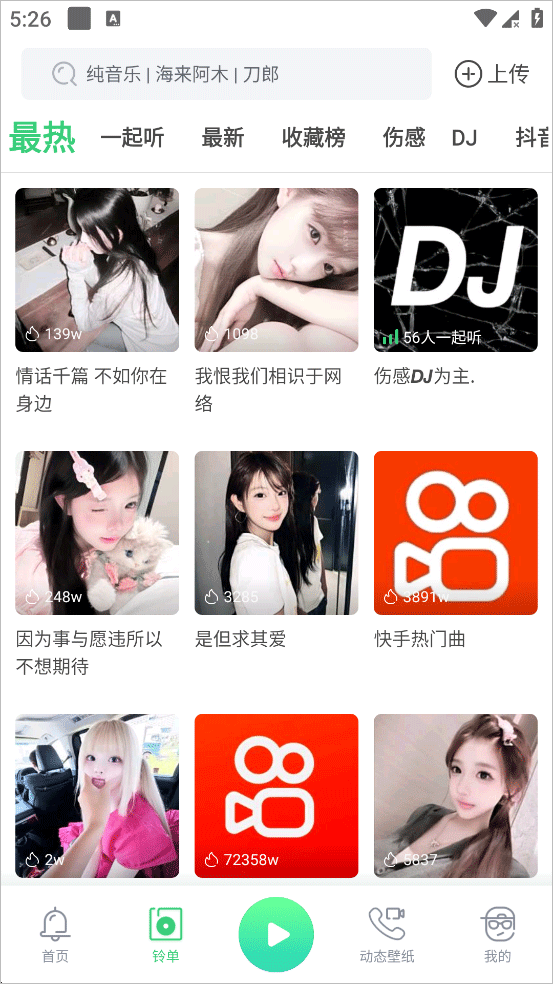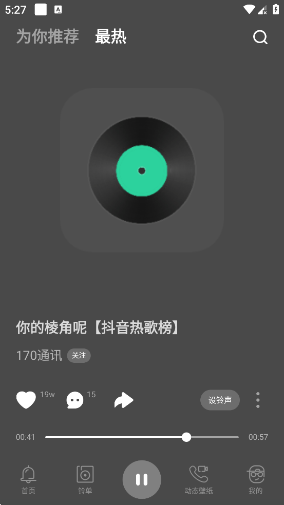 3、点击中间的播放键,软件内会随机为你播放热门铃声,下滑可以刷新歌曲