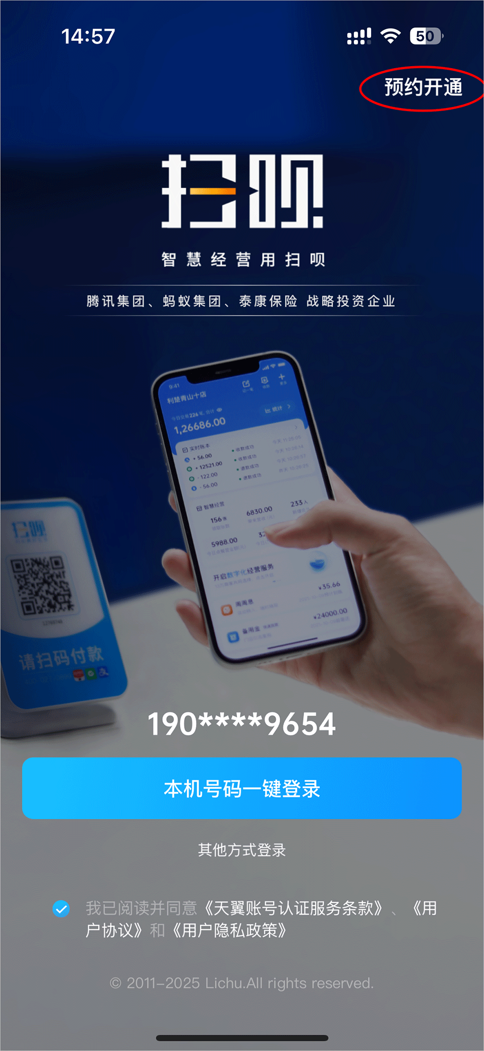 1、在本站下载扫呗app后,打开软件点击右上角的预约开通。