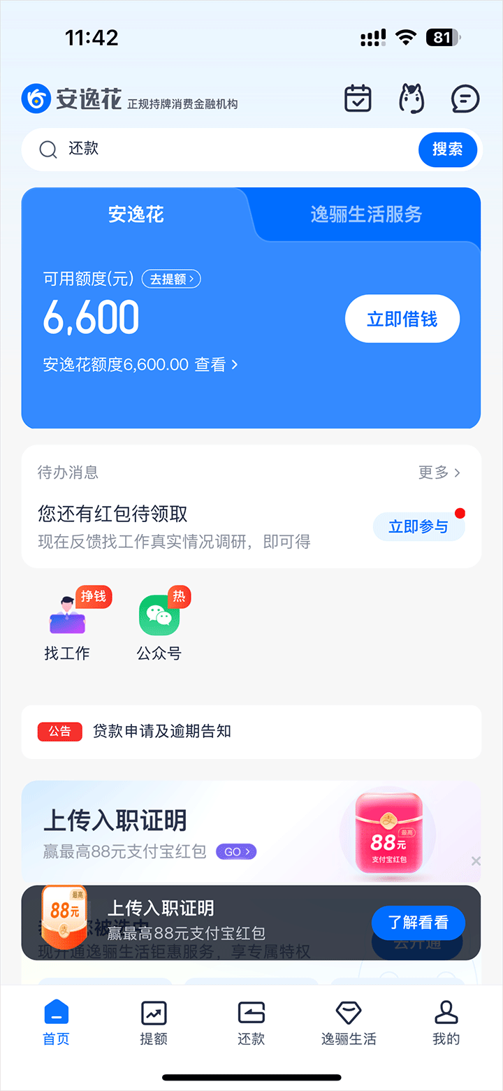 安逸花app是一款正规好用的金融借贷服务软件,旨在为用户提供专业借贷服务,解决资金难题,在金融领域深受用户信赖。软件是由银监会批准成立,持有正规金融运营牌照,不是高利贷软件,可以放心的使用。此外,用户可以在额度范围内进行分期借钱贷款,在享受便捷、专业、智能、安全分期借钱贷款的同时,可自主提现支付,最快1分钟就可以贷款到,让你随时提现贷款。最重要的是安逸花的利率十分低,而且还能自由选择分期时长,让用户减少每月还款压力,急需要钱的朋友赶快下载使用吧。