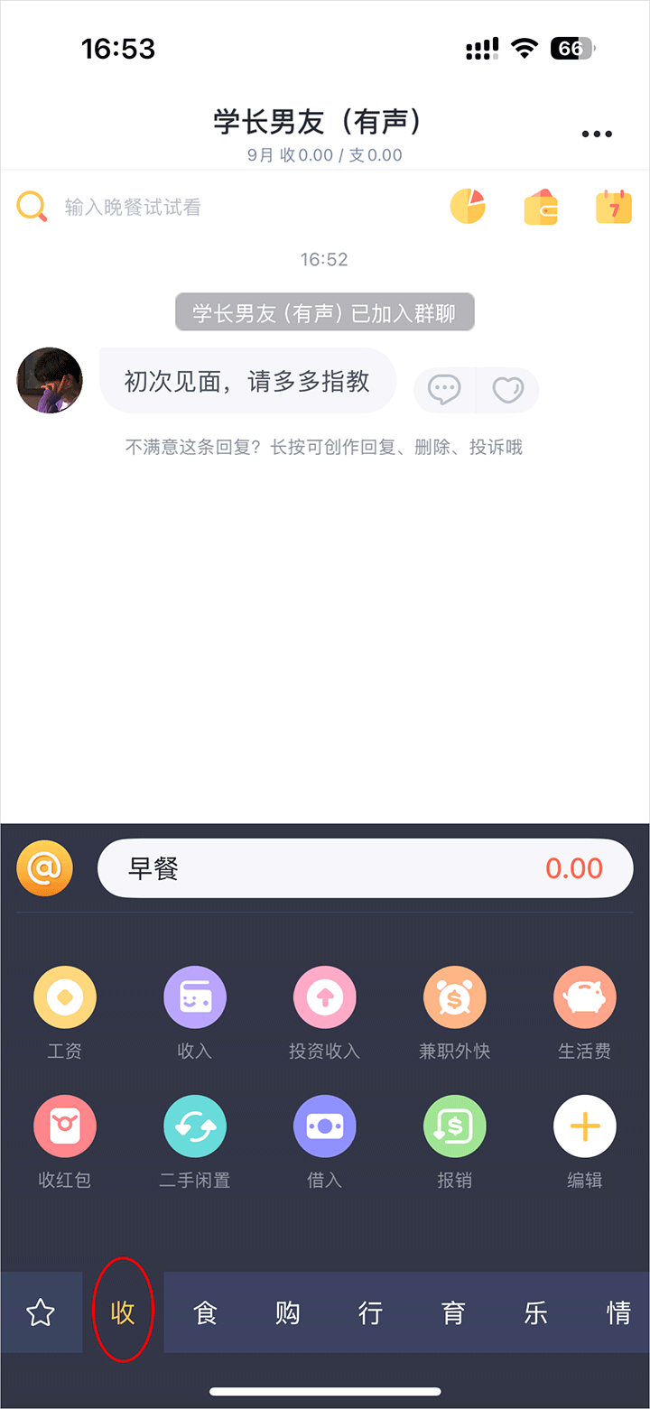 2、进入界面点击收即可记录收入的情况