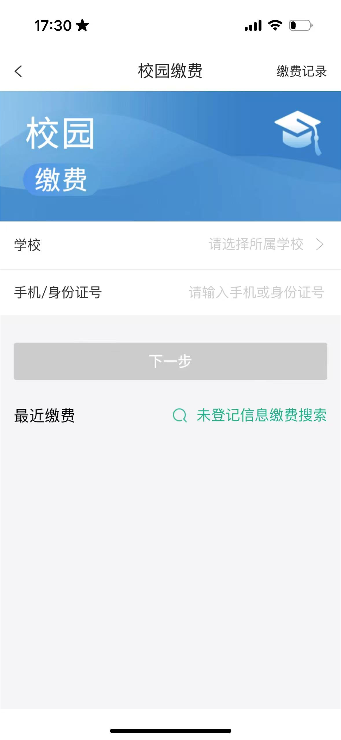 3、进入校园缴费后填写学生的学校和个人信息后点击下一步即可看到学费账单