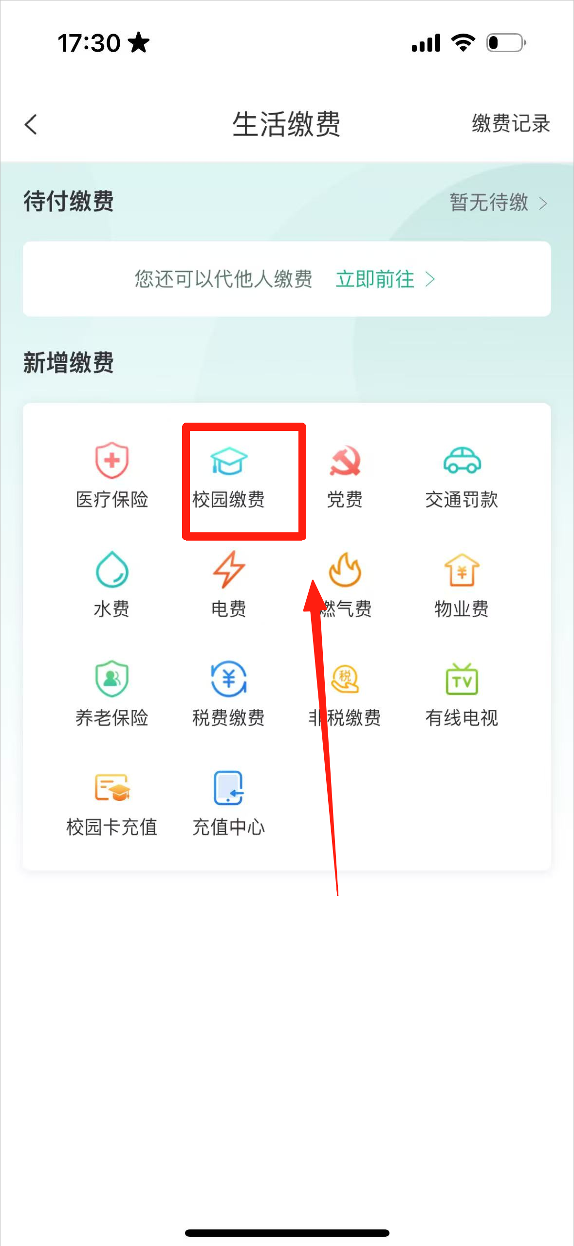 2、进行生活缴费页面,这里可以交社保、水电费、物业费等各种生活费用,点击“校园缴费”
