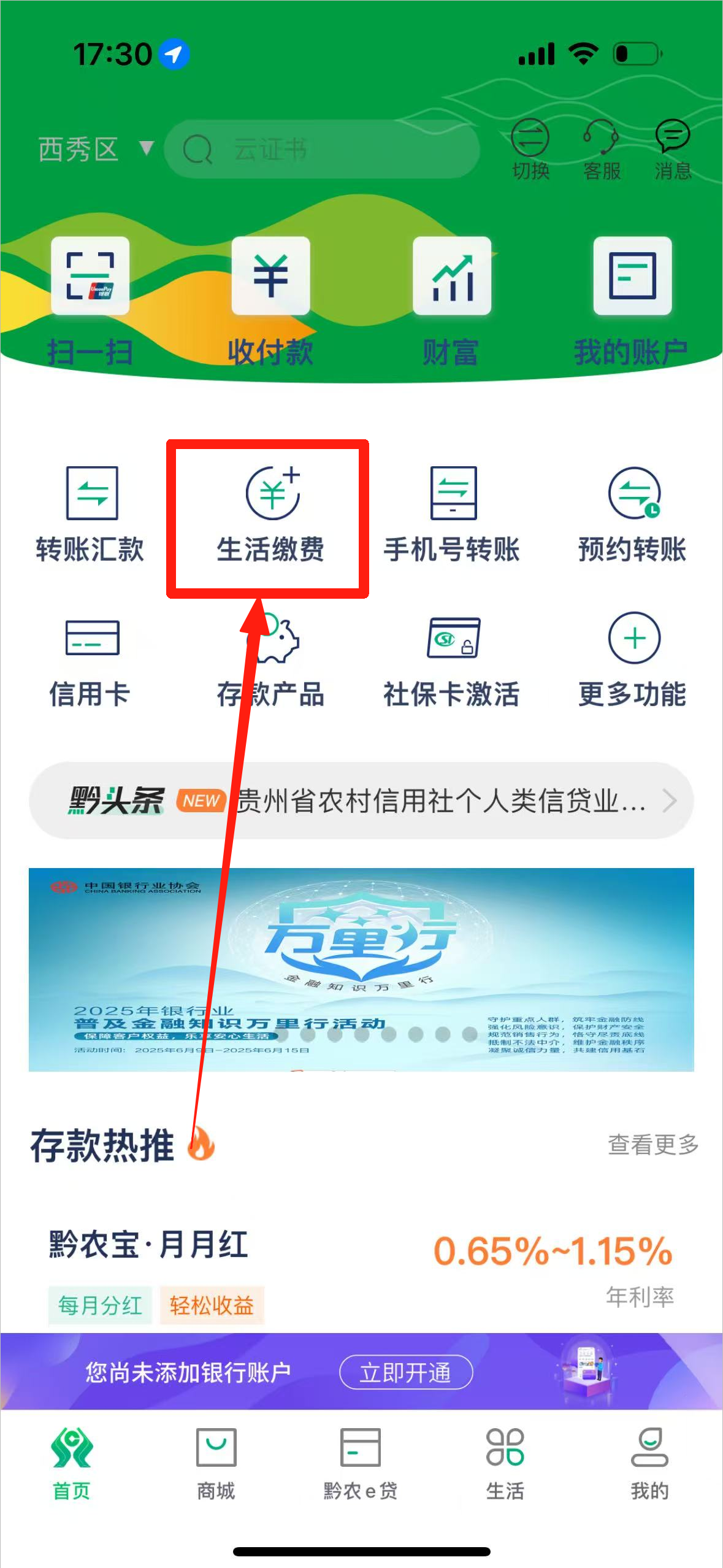 生活缴费主要实现水电煤、电视费、交通罚款等缴纳,同时提供收费款项账单导入功能,满足幼儿园、小区物业费等企事业单位的收费需求。