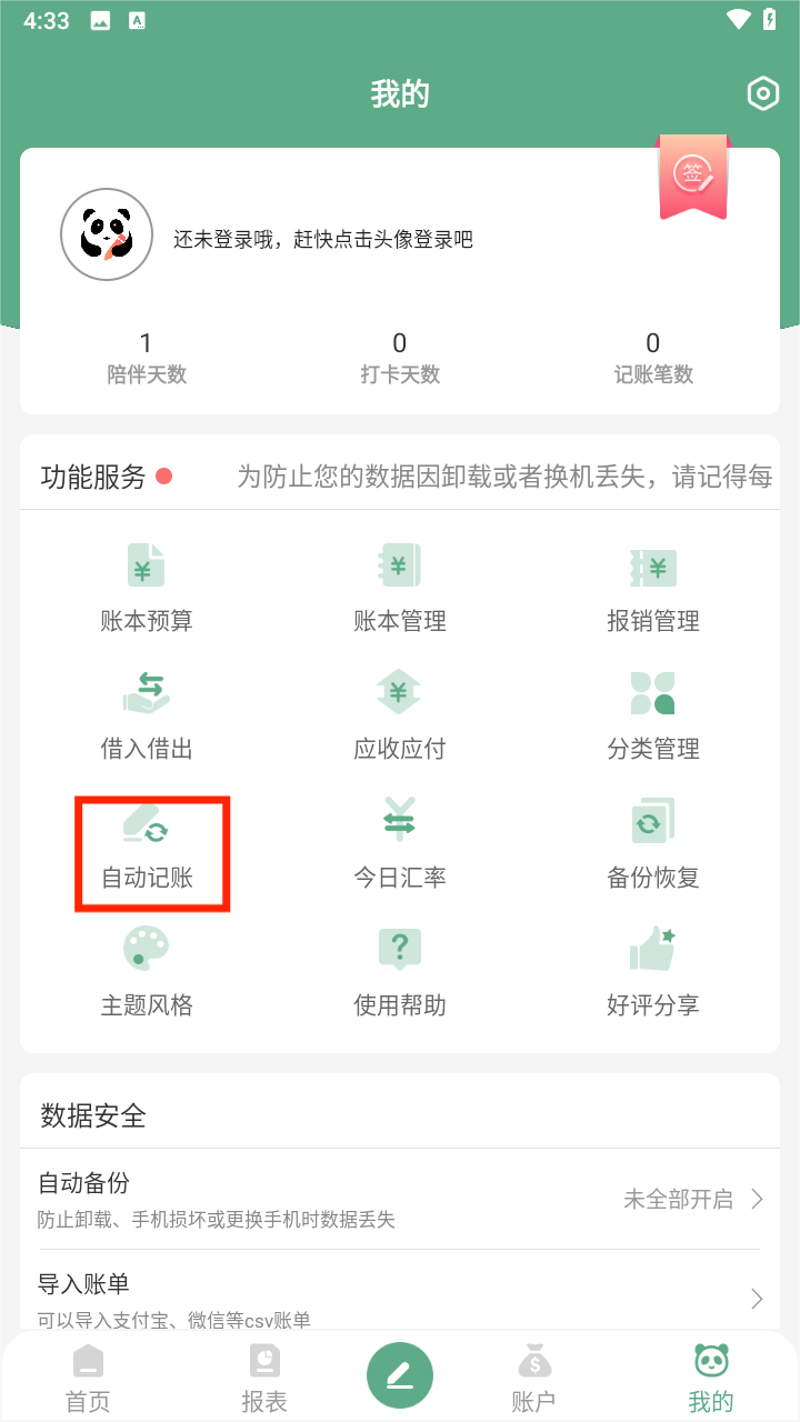 2、在“我的”页面中你可以看到账本管理、报销管理、分类管理、备份恢复等各种实用功能,选择“自动记账”功能进入。