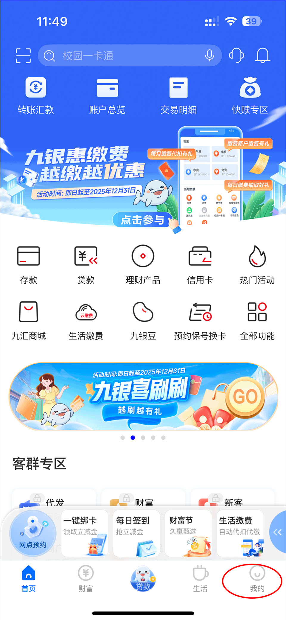 1、首先在本站下载九江银行app官方最新版,登录之后点击右下角【我的】