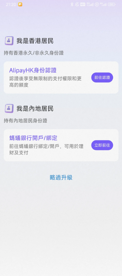 4、注册成功后可以绑定身份验证有AlipayHK身份认证,和银行开户/绑定