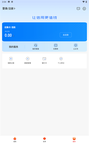 3、我的,可以清楚看到待还款数额,绑定银行卡、个人积分、优惠券、额度管理等功能。