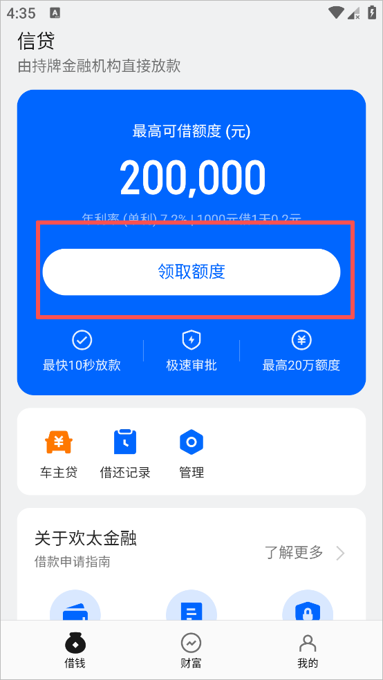 1、打开app点击首页的“领取额度”