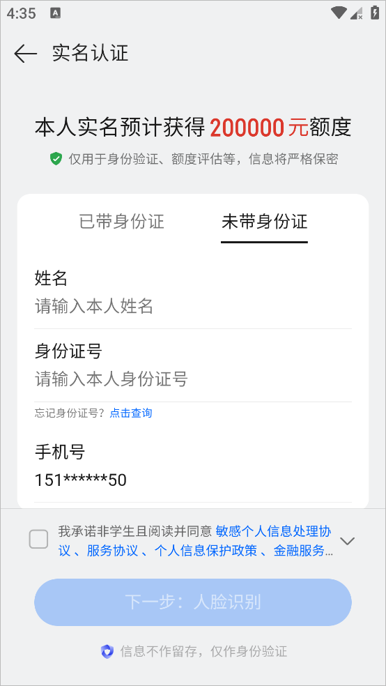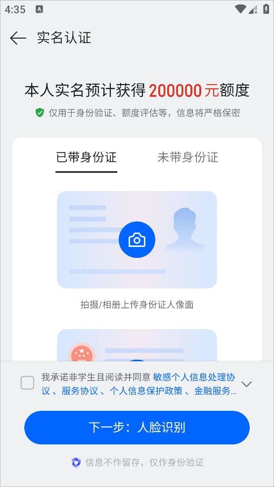 2、上传身份证照片后点击下一步人脸识别