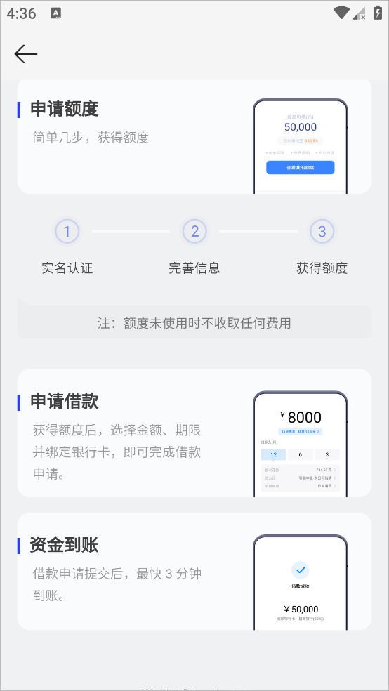 4、审批快捷:3步获取额度,实名认证→人脸认证→查看额度。