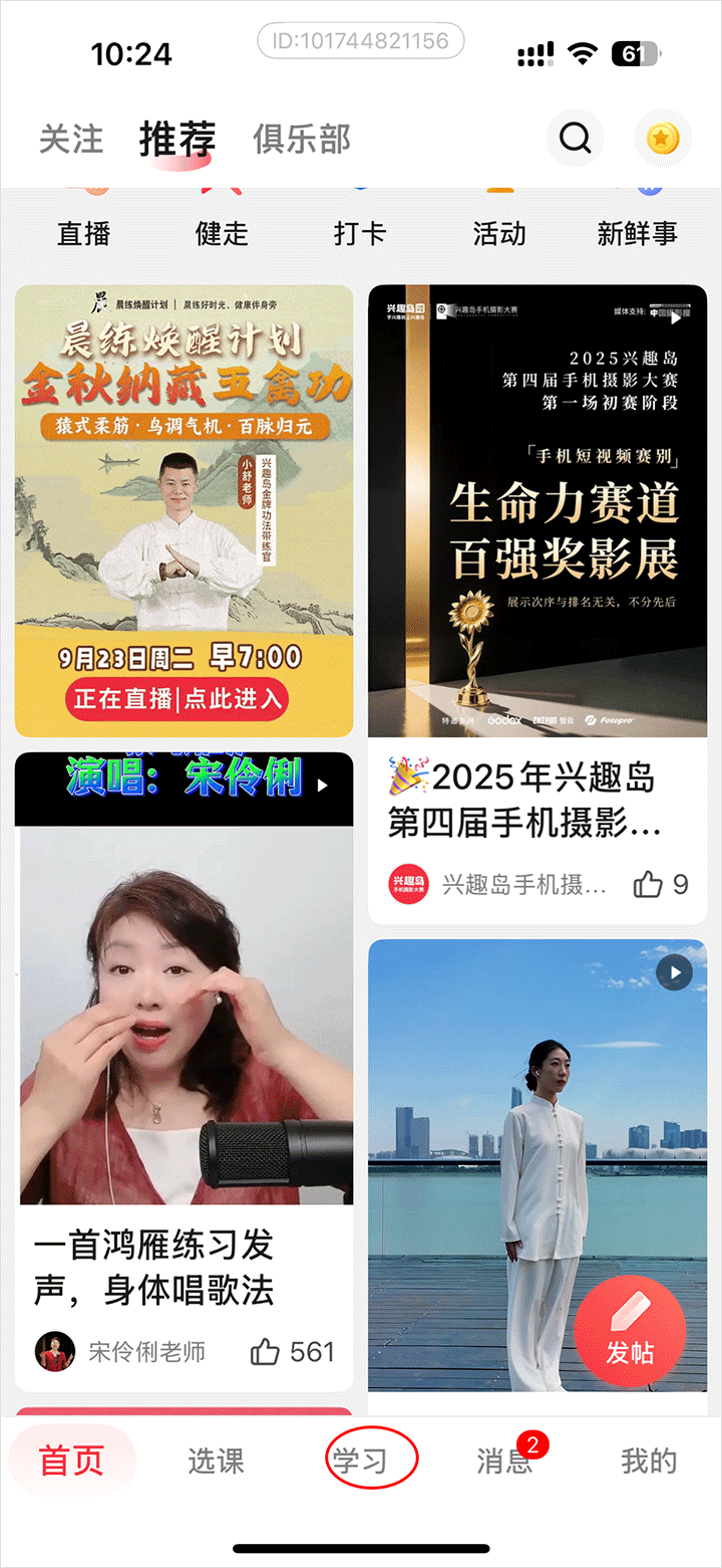 1、打开兴趣岛app官方最新版进入首页点击下方的学习栏目