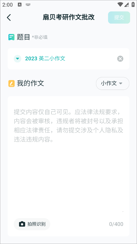 3、接着就可以按照题目编写作文,此外还可以点击左下角的拍照上传,上传已经编写好的作文图片,编写/上传完成后点击右上角的提交