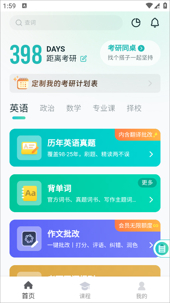 扇贝考研app是一款专为考研人群设计的学习软件,提供英语、政治、数学及专业课等全科备考服务。涵盖了历年考研英语试题,包括英语一/二,用户可以在线学真题,积累经验。查询词汇的时候还支持精准查词,优先展示词汇在真题中的含义和考频,使得学习更高效。并有作文批改功能,AI结合阅卷标准进行打分纠错,提供逻辑结构、句式优化等修改建议。 此外app内还汇集了全国各大院校的招生信息及教育部门最新动态,让考生能够第一时间掌握考研资讯,做出明智的选择。