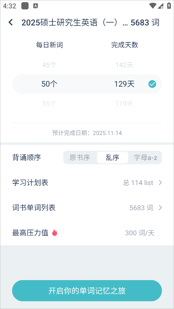 4、挑选一本书籍后,可以制定自己的学习计划,精细到每天需要完成几个新单词,设置好后点击开启