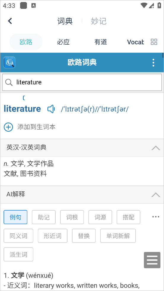 - 专业词典,支持欧陆/有道/牛津/朗文/剑桥/柯林斯等专业词典查询