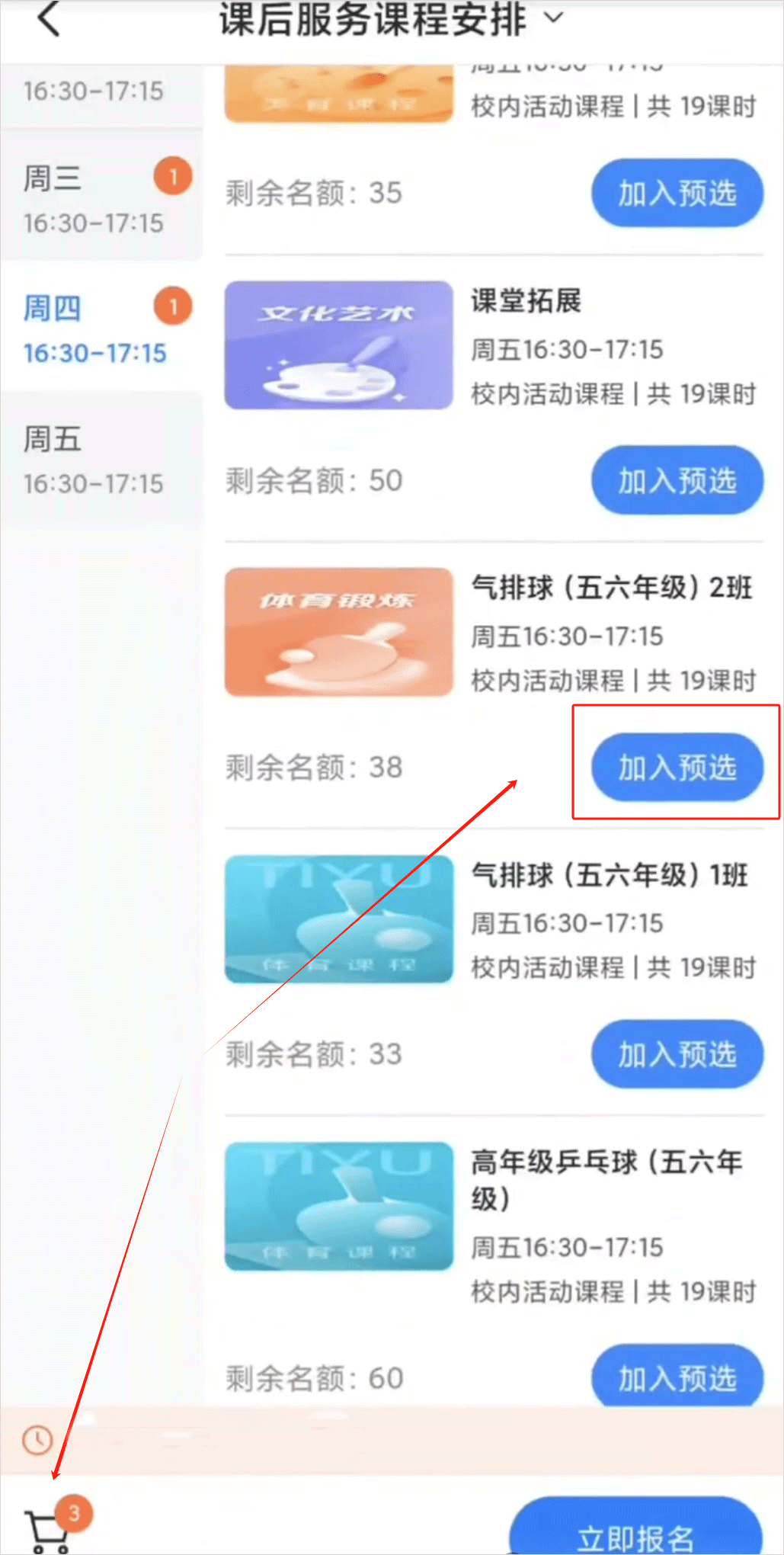 需要注意的是,选课只可在学校设置的选课时间段内方可进行,在非选课时间家长是无法进行选课操作的。只在该课程预选人数超过该课程报名人数上限,则家长需在选课阶段手动报名该课程。