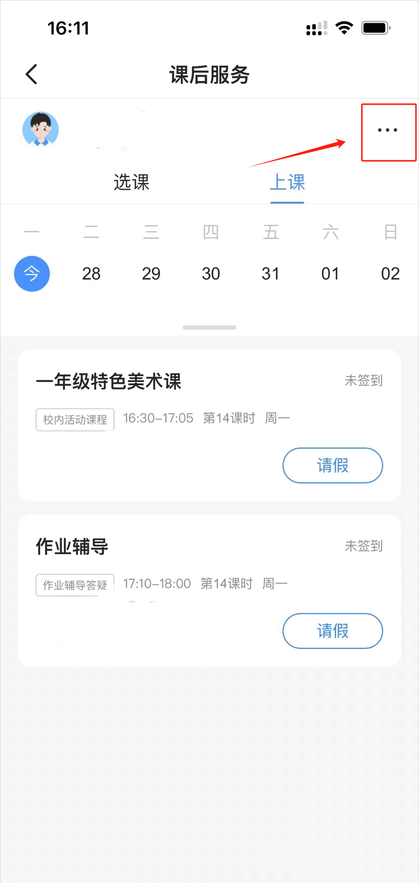 在进入课后服务后,家长可以点击页面上方导航栏的【选课】和【上课】进行页面的切换查看,若未在学校设定的选课时间段内则无法进行选课,课后服务选课页面上会显示【本学期选课报名已结束】。若家长有多个孩子,在给不同的孩子进行选课时,需点击页面左上角的孩子姓名切换至对应的孩子进行选课。注:已经过了选课时间暂无操作