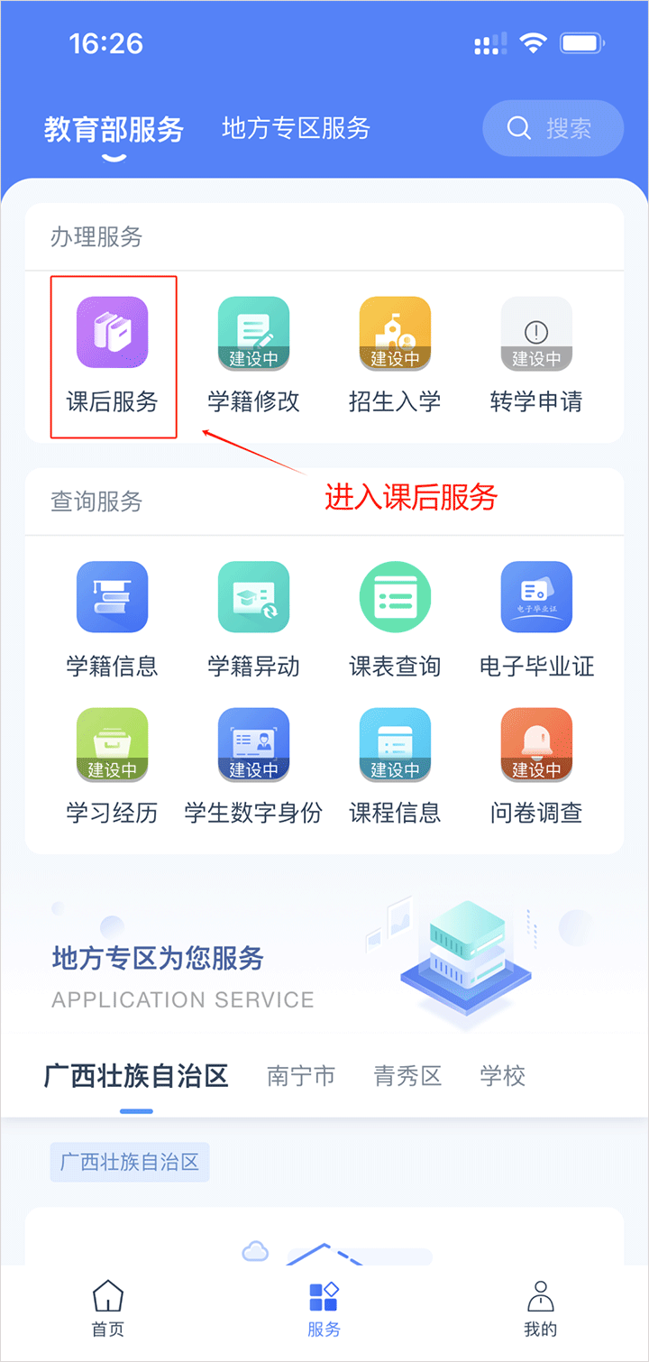 完成账号注册后,返回至登录页面,输入对应的账号密码即可进入应用。在页面底部切换至【服务】栏,家长可以在【业务办理】中,点击【课后服务】,进入课后服务。