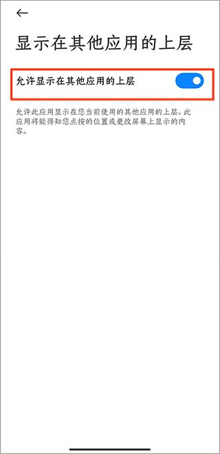 4、大家可根据自身手机设置来进行设置,如小编所示点击开启【允许显示在其他应用上方】的按钮即可