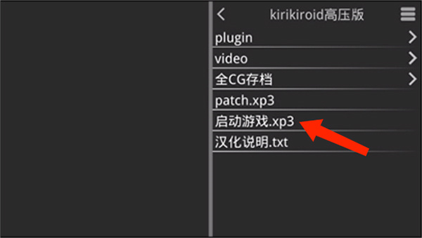 5、包括plugim、video、全CG存档、patch.xp3、启动游戏.xp3和汉化说明等选项,选择[启动游戏]选项。