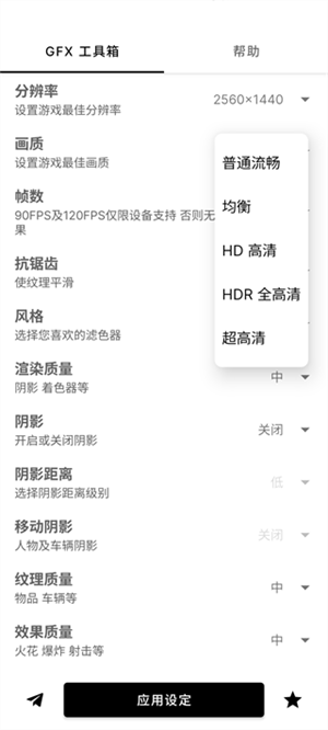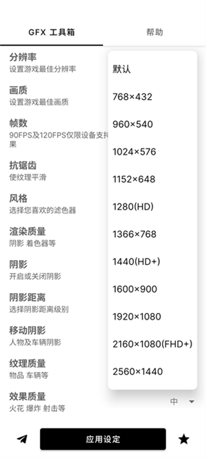 3、GFX Tool除了可以调画质,还可以调分辨率,在“分辨率”一项你可以选择游戏分辨率,从最低的“768*432”到最高“2560*1440”都可以选择。