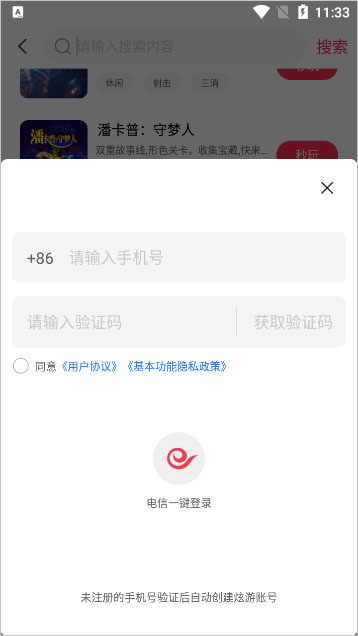 1、下载安装软件,打开天翼云游戏app,点击账号注册登录;